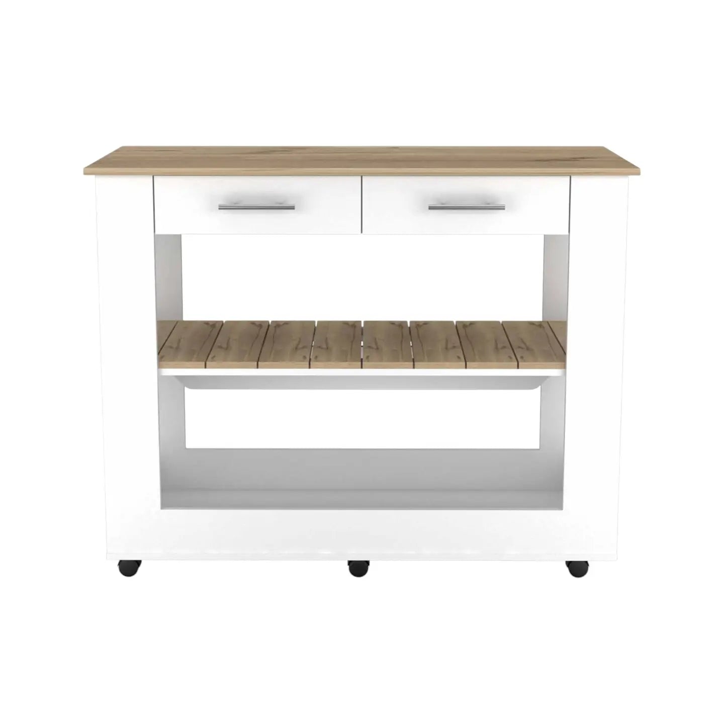 Isola da cucina in legno rovere chiaro e bianco con ripiani e cassetti