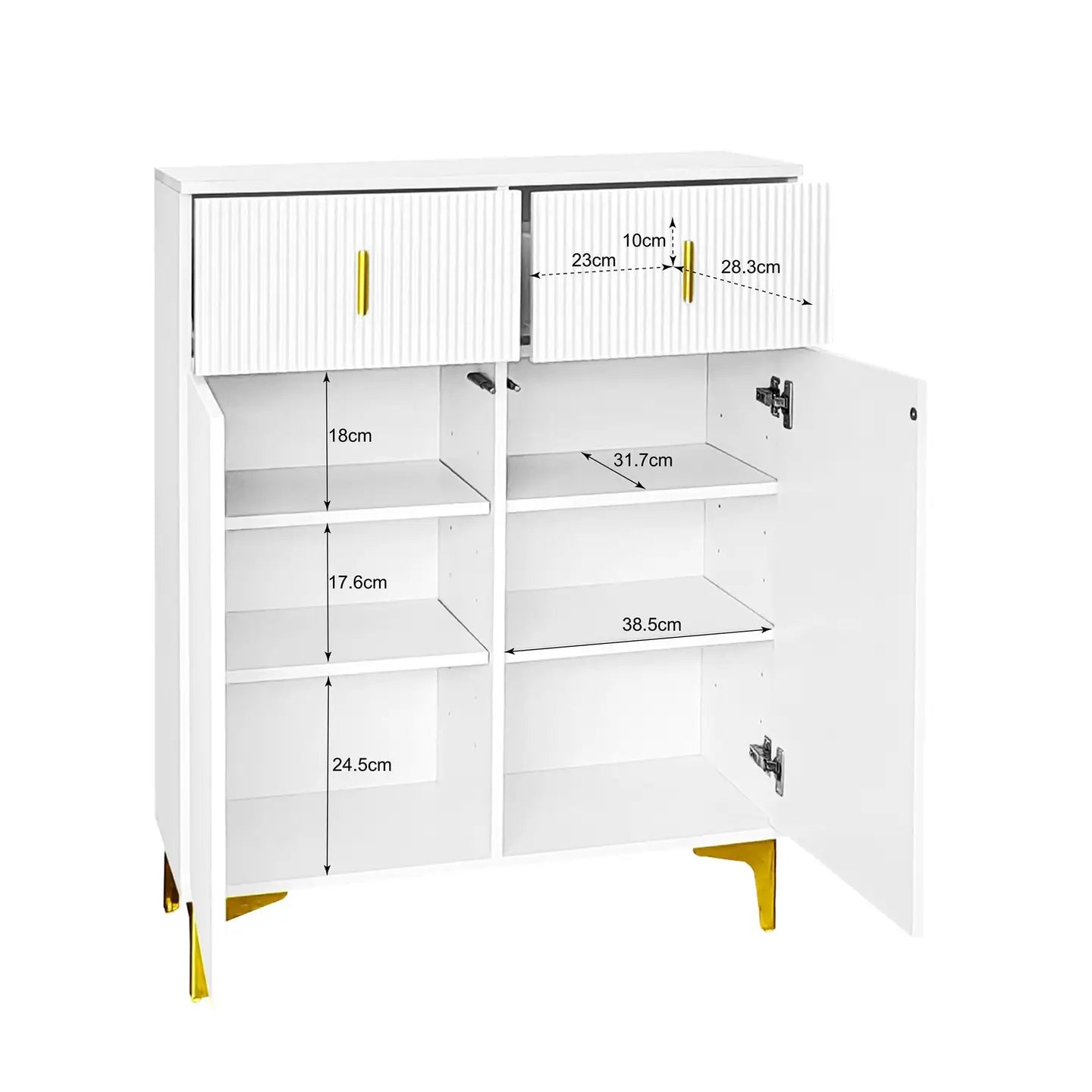 Questa combinazione di armadi si distingue per un design elegante e moderno e comprende una scarpiera con due cassetti e due ante e un appendiabiti con ganci dorati. Il cuscino morbido offre comfort ed estetica aggiuntivi. Il prodotto è realizzato con materiali di alta qualità che garantiscono durata e longevità. Le maniglie, i piedi e i ganci dorati aggiungono un tocco di lusso e raffinatezza al design complessivo. La superficie delle ante e dei cassetti è decorata con una speciale texture ondulata, che migliora l'aspetto e conferisce un look unico ed elegante. Le ante sono dotate di cerniere ammortizzate e di un design push-to-open, garantendo comfort e sicurezza quotidiana. Questo design ponderato garantisce un funzionamento fluido e silenzioso. Questa combinazione di armadi offre molto spazio di archiviazione grazie ai suoi numerosi scomparti, rendendola una soluzione pratica per organizzare scarpe, cappotti e altri accessori. Il loro bell'aspetto li rende una scelta perfetta per tutti.